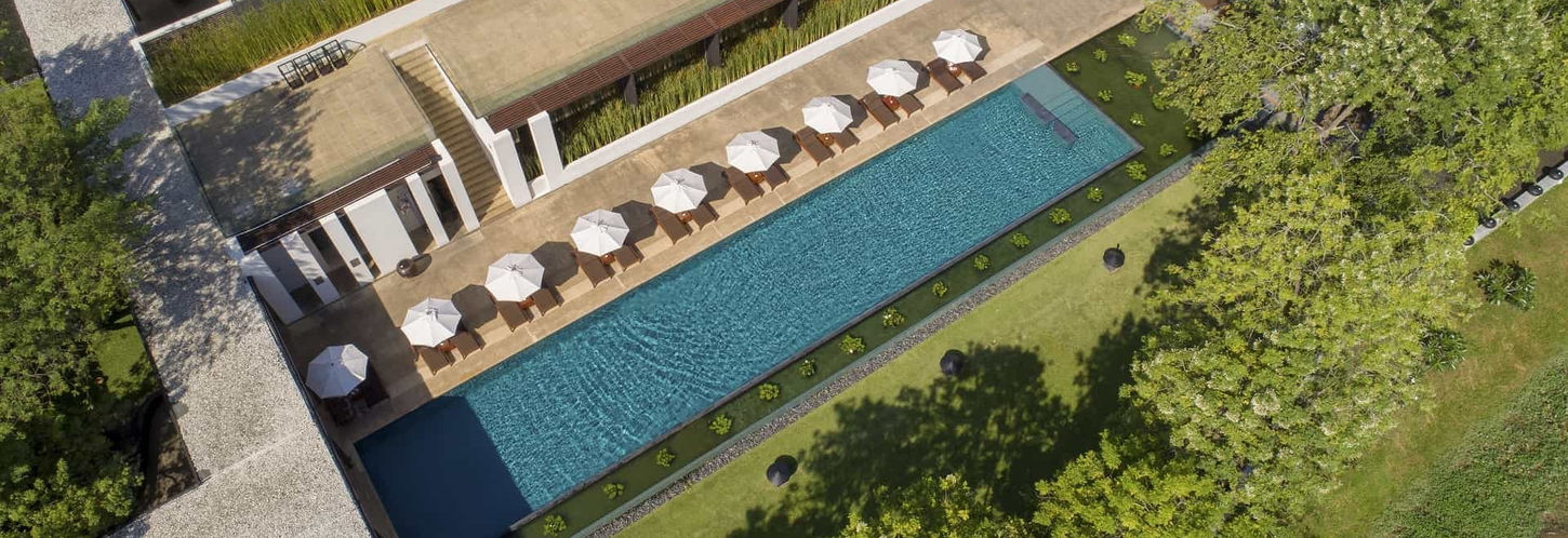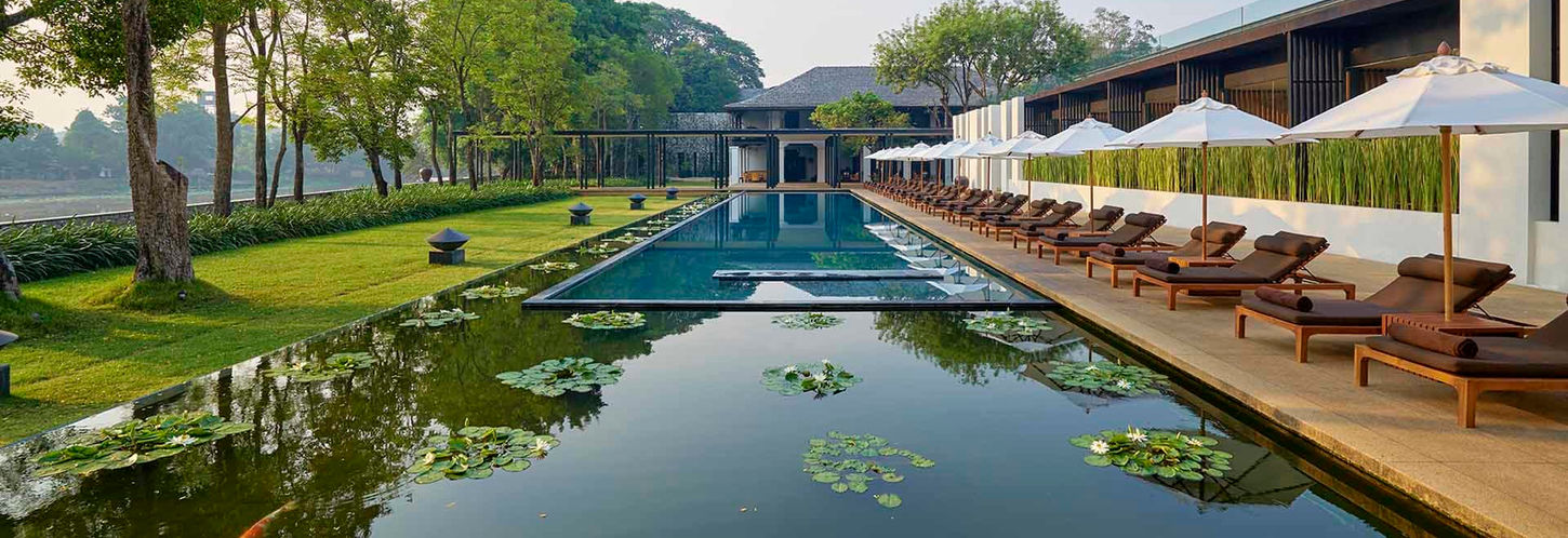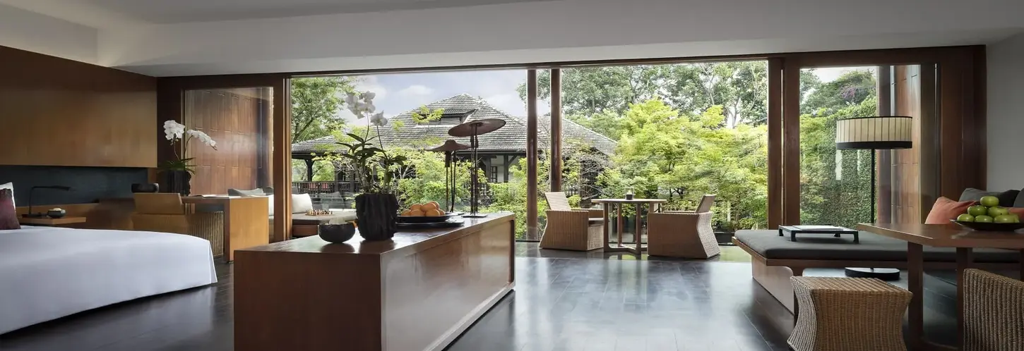 飯店的建築設計由傳奇大師 Kerry Hill 操刀,利用簡約的水平線條與深色木柵,將現代感隱入兩側繁茂的熱帶花園中。走在如鏡面般的水池旁,看著古老建築的倒影在夕陽下緩緩散開,那份如詩般的寧靜,正是我們在繁忙生活中渴望的避風港。