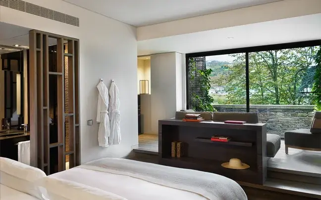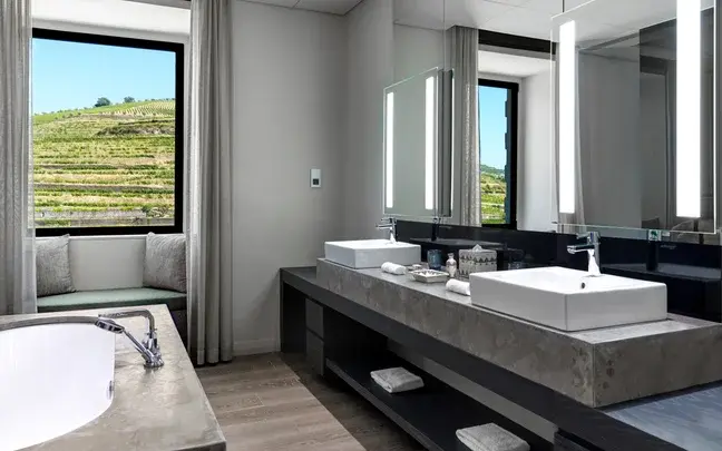 飯店坐落於一座原始葡萄酒莊園之上,建築風格將葡萄牙傳統石造莊園元素與極簡現代美學融合。裸露石牆 、手工木梁、拱形窗戶與瓷磚地板,不僅呈現歷史感,也讓室內與自然景觀無縫對話。寬敞的落地窗將杜羅河的壯麗景色引入每間客房與套房,陽光灑落於天然木材與精緻織品之間,營造出溫暖而內斂的奢華氛圍。部分獨棟別墅更擁有私人泳池與葡萄園全景,讓旅客在寧靜之中盡情享受山谷的壯麗景致。