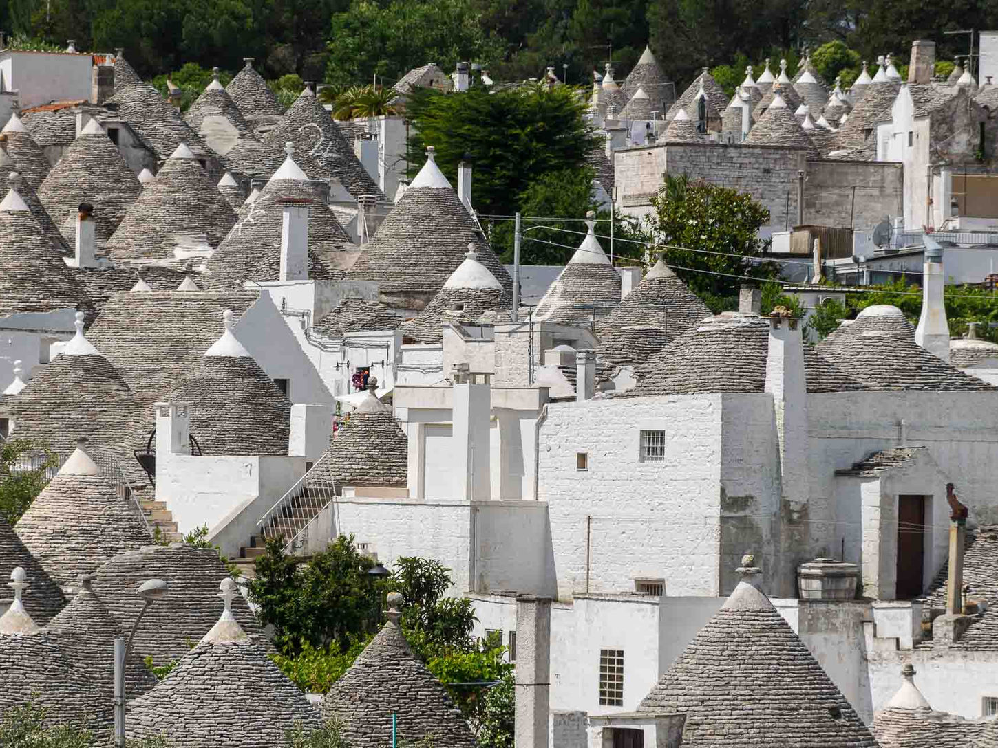 阿爾貝羅貝洛(Alberobello)以其舉世無雙的尖頂石屋——Trulli 建築群聞名於世。放眼望去,一座座灰白色的圓錐屋頂如童話世界裡的小帽子般錯落排列,在南義陽光下閃耀著古老而純粹的光澤,彷彿時間在此放慢了腳步。